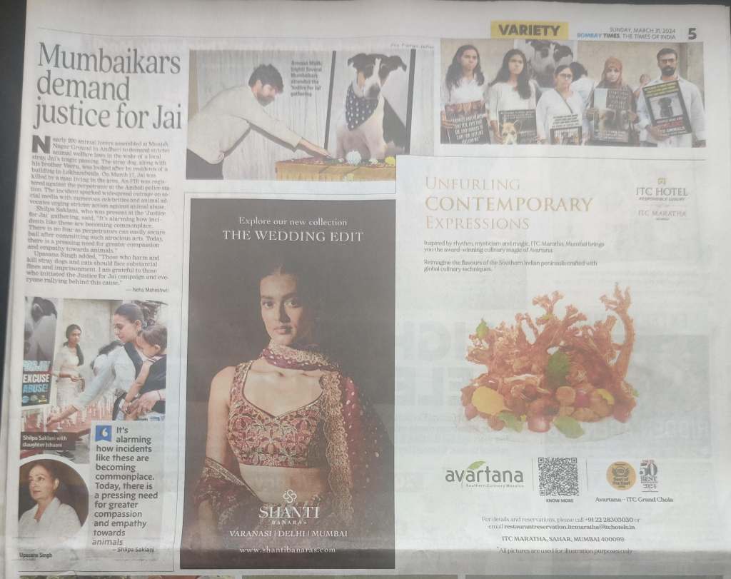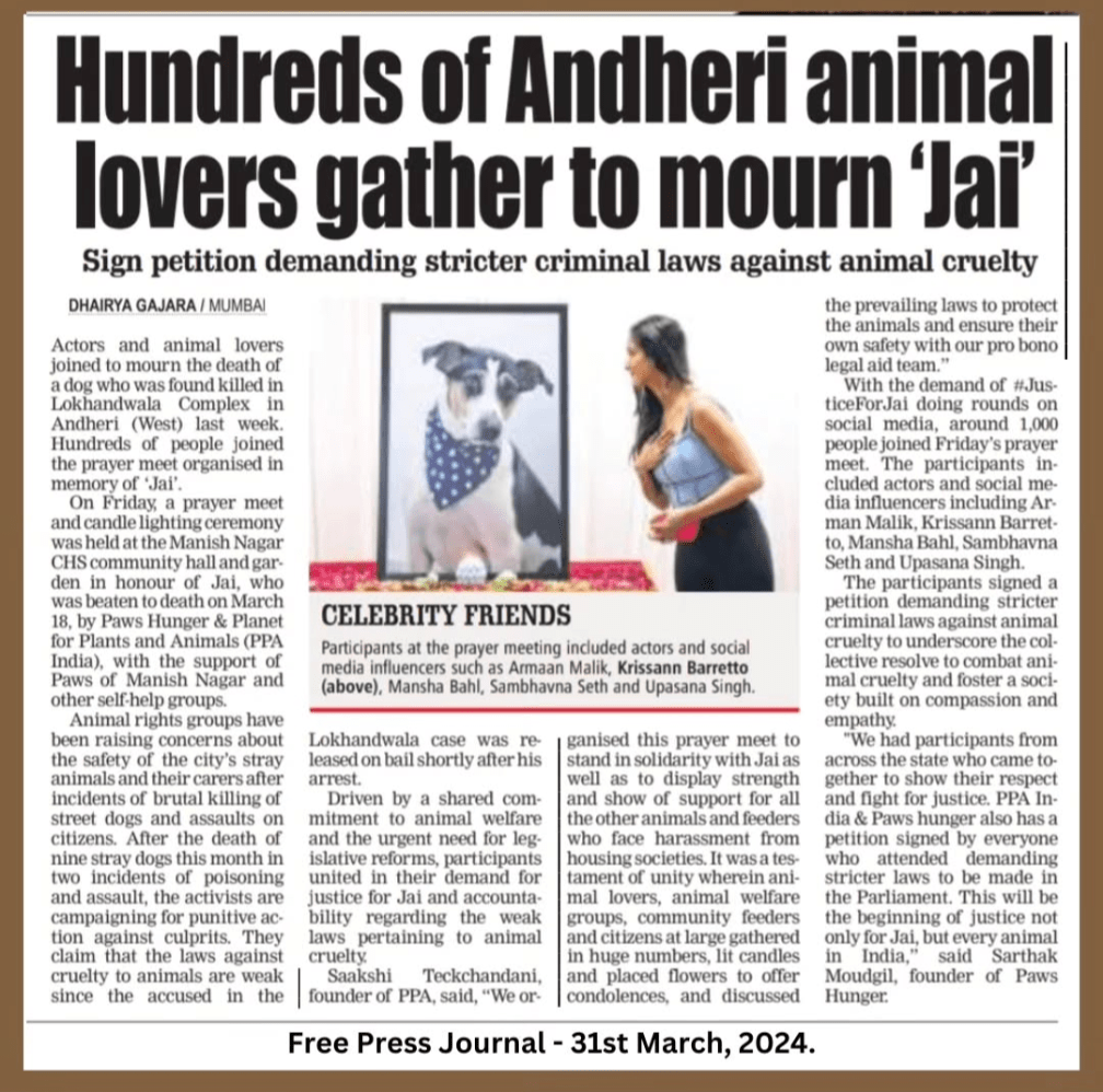 In the wake of the tragic death of Jai, a beloved stray dog brutally beaten in Andheri Lokhandwala, Paws Hunger joined animal lovers, celebrities, and citizens in demanding justice. The incident sparked widespread outrage and reminded us why our workโto protect and speak up for the voicelessโis more urgent than ever.